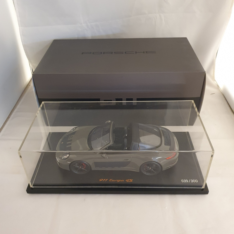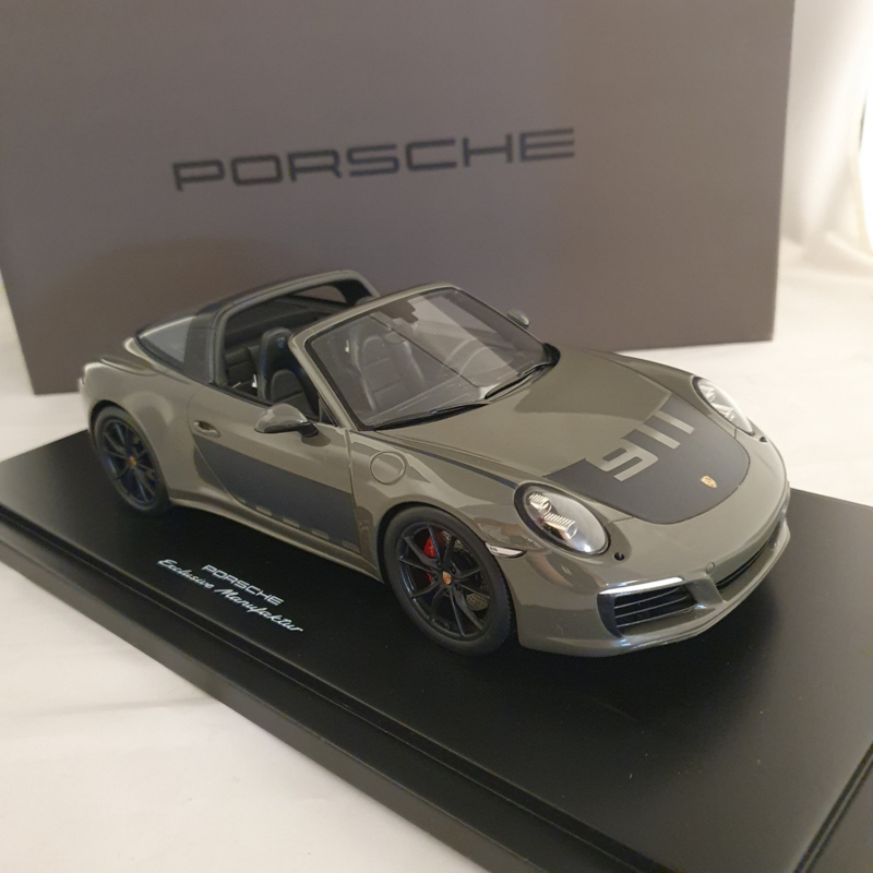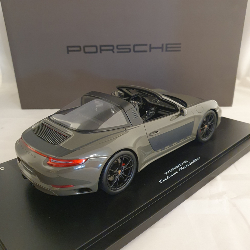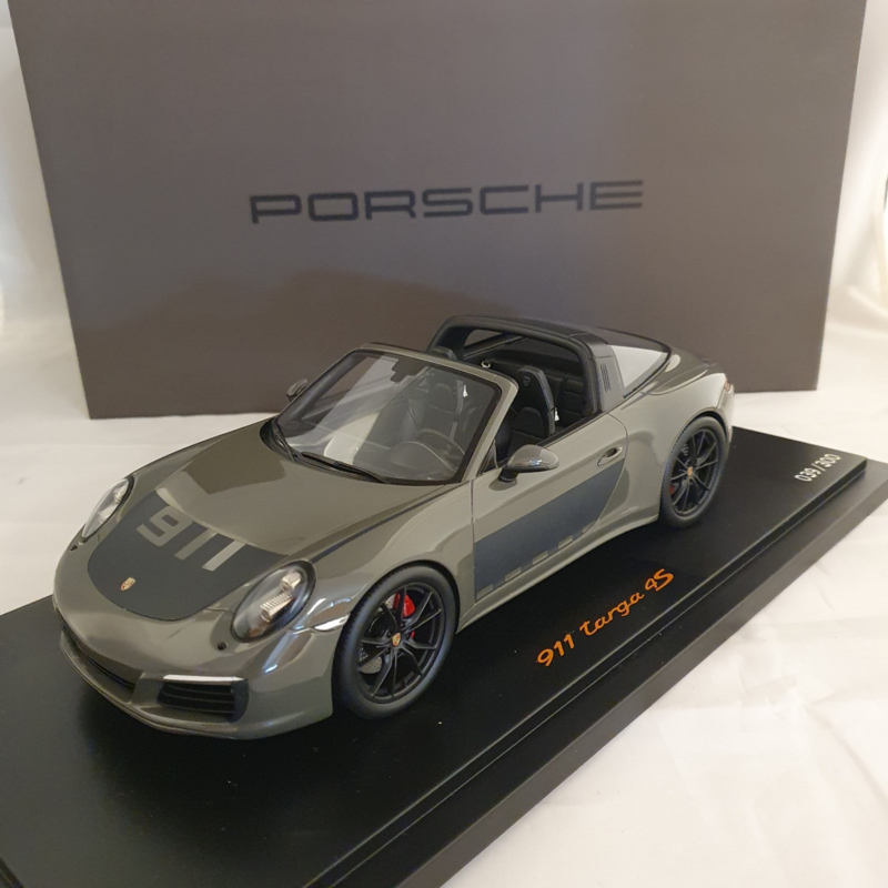 Modèle réduit Porsche de la Porsche 911 (991) Targa 4S 2018 à l'échelle 1:18. Cet objet de collection détaillé possède un extérieur gris foncé métallisé.