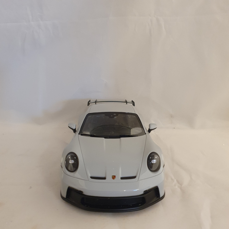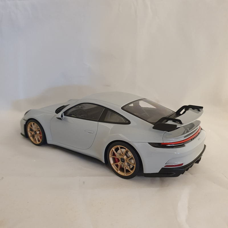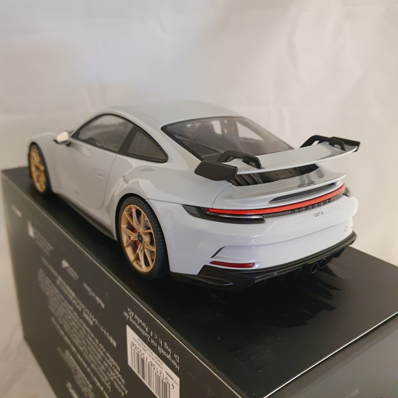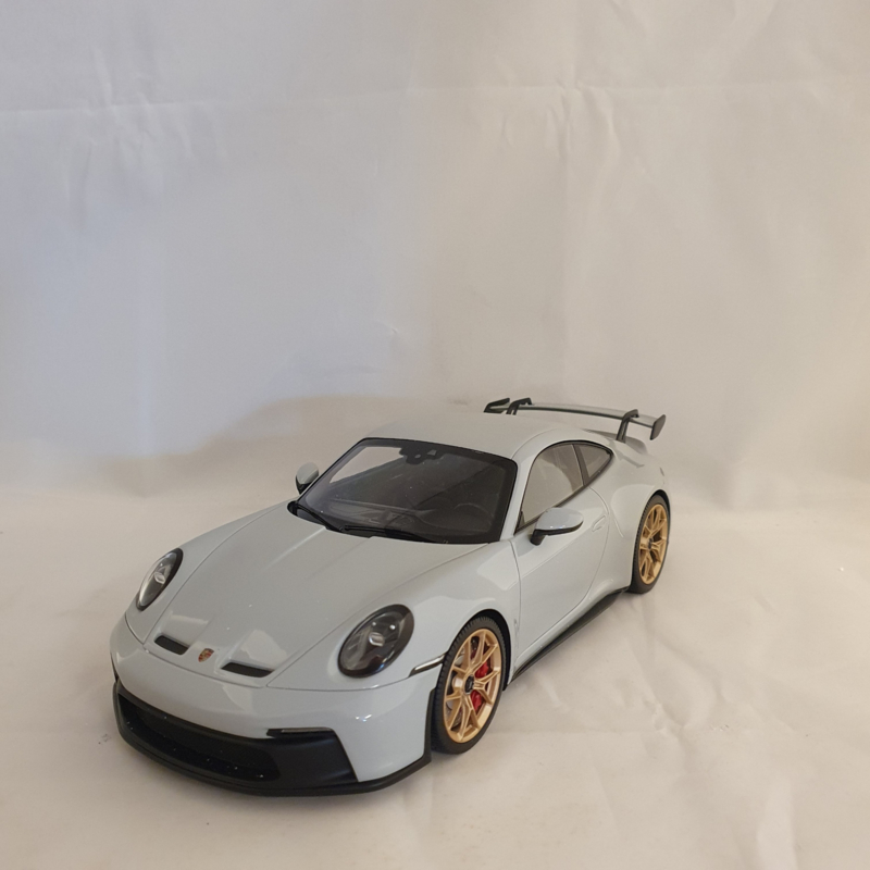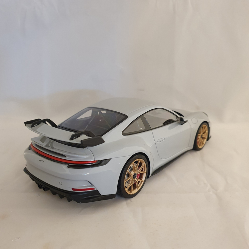 Modèle réduit Porsche de la Porsche 911 992 GT3 2021 en couleur Gris Craie avec des jantes dorées.
