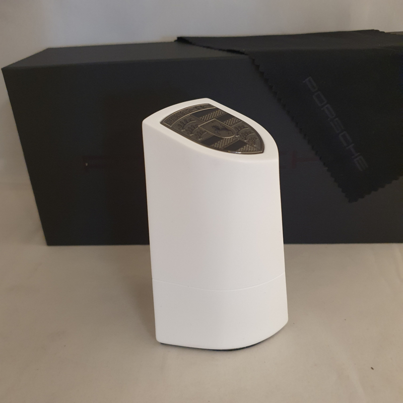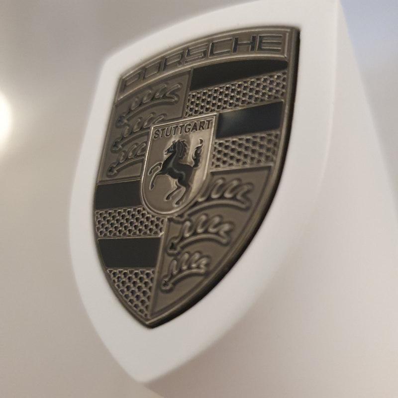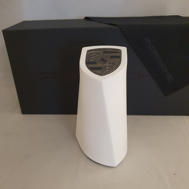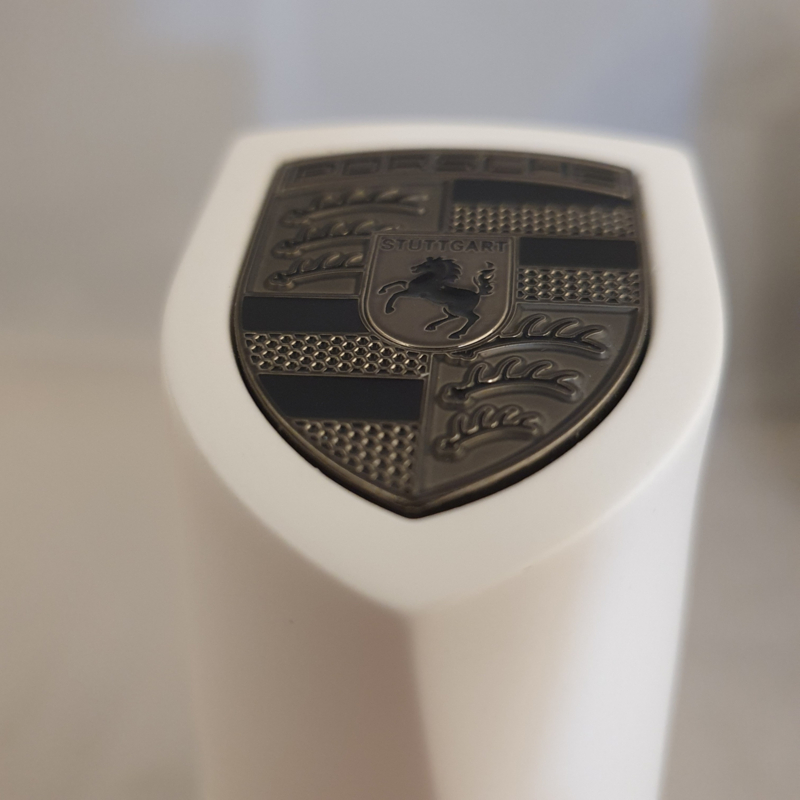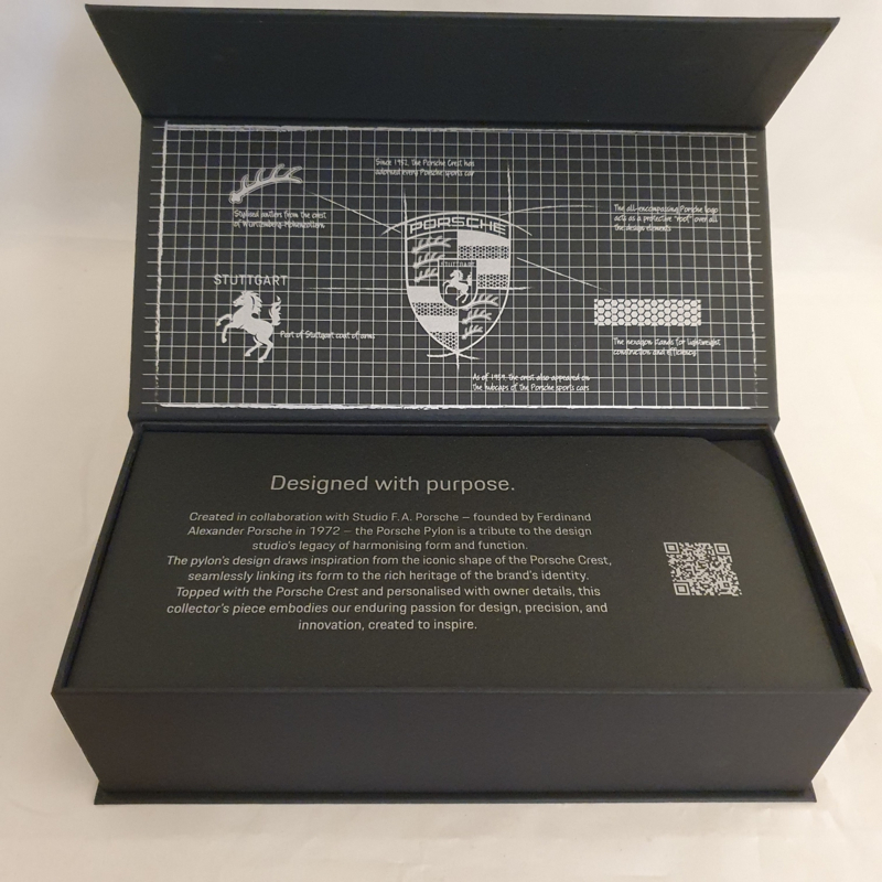 Chaque détail est soigneusement conçu. L'emballage extérieur, avec les lettres Porsche embossées à l'intérieur. L'intérieur de la boîte, qui montre les explications et les détails de chaque partie de l'emblème Porsche. Le magnifique chiffon en microfibre avec le nom « Porsche » également embossé, et enfin le pylône lui-même, fabriqué en poudre de pierre compressée avec un fond en velours fin.