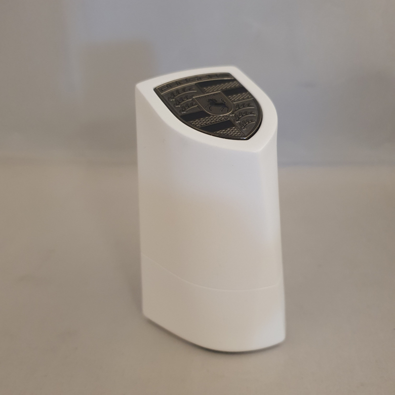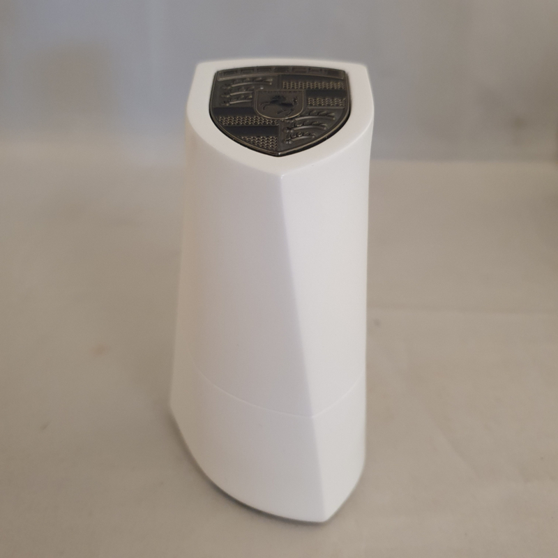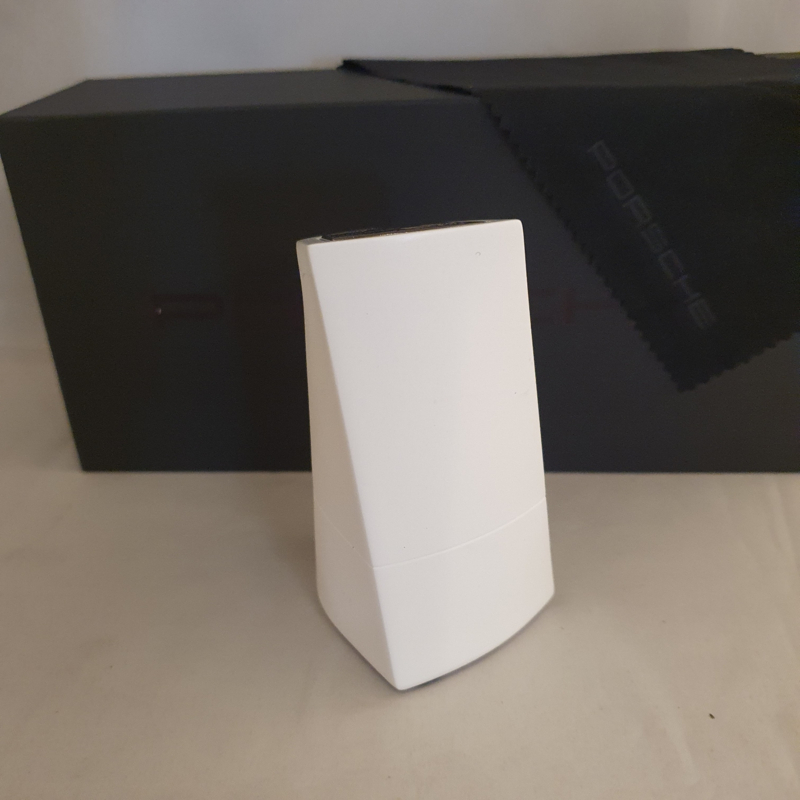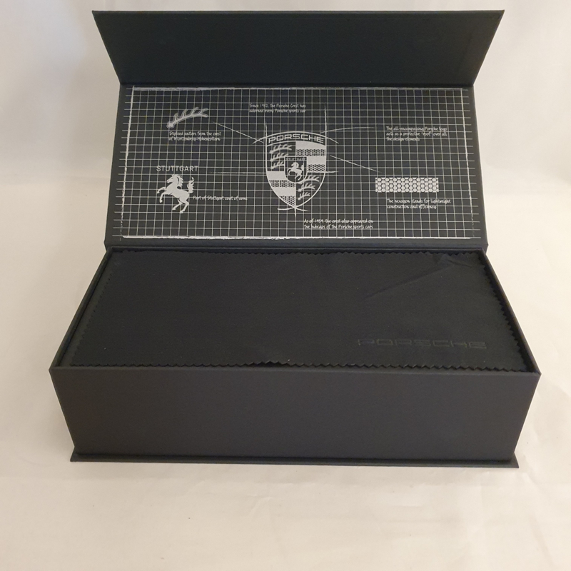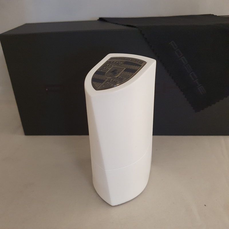 Chaque détail est soigneusement conçu. L'emballage extérieur, avec les lettres Porsche embossées à l'intérieur. L'intérieur de la boîte, qui montre les explications et les détails de chaque partie de l'emblème Porsche. Le magnifique chiffon en microfibre avec le nom « Porsche » également embossé, et enfin le pylône lui-même, fabriqué en poudre de pierre compressée avec un fond en velours fin.