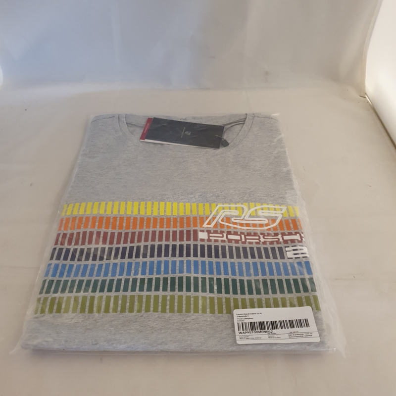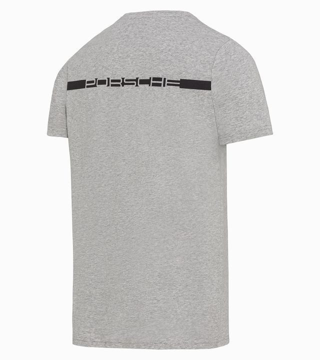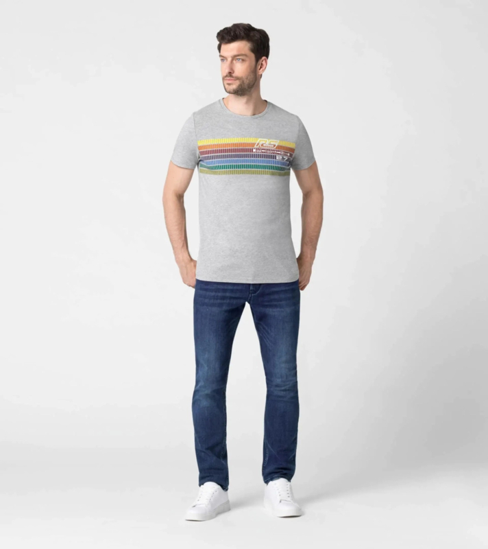 Ce t-shirt pour hommes de la collection RS 2.7 est réalisé en gris chiné avec un motif rayé sur la poitrine, inspiré par la diversité lumineuse de couleurs de la 911.